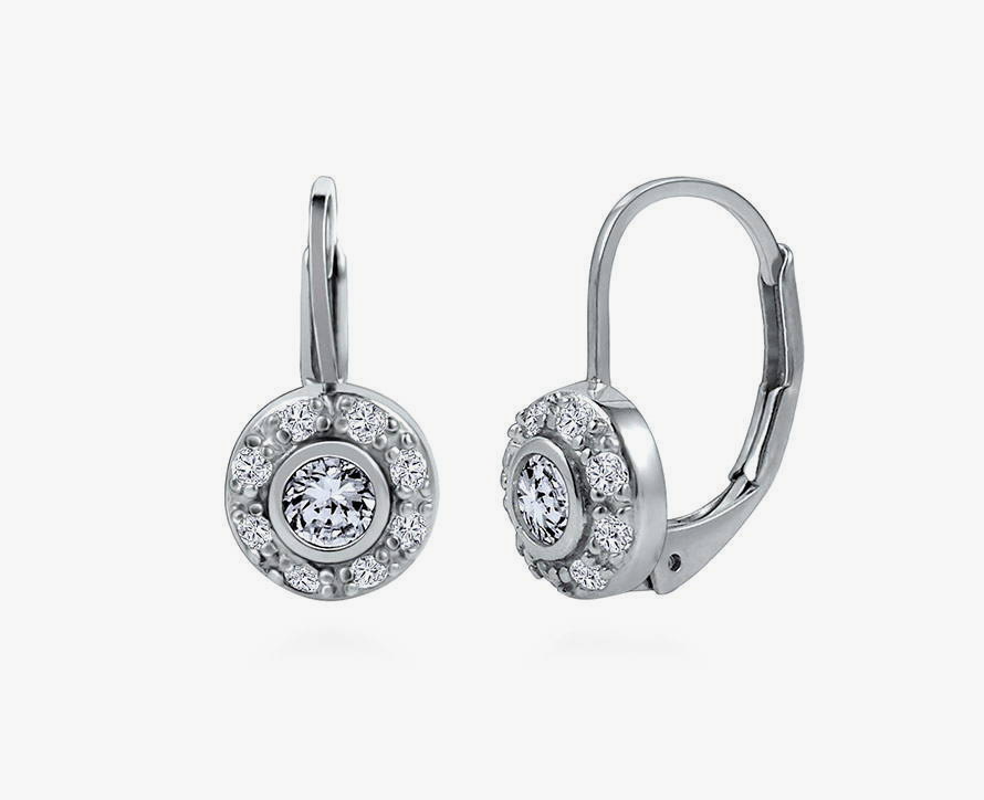 Halo Round CZ Leverback Dangle Earrings in Sterling Silver