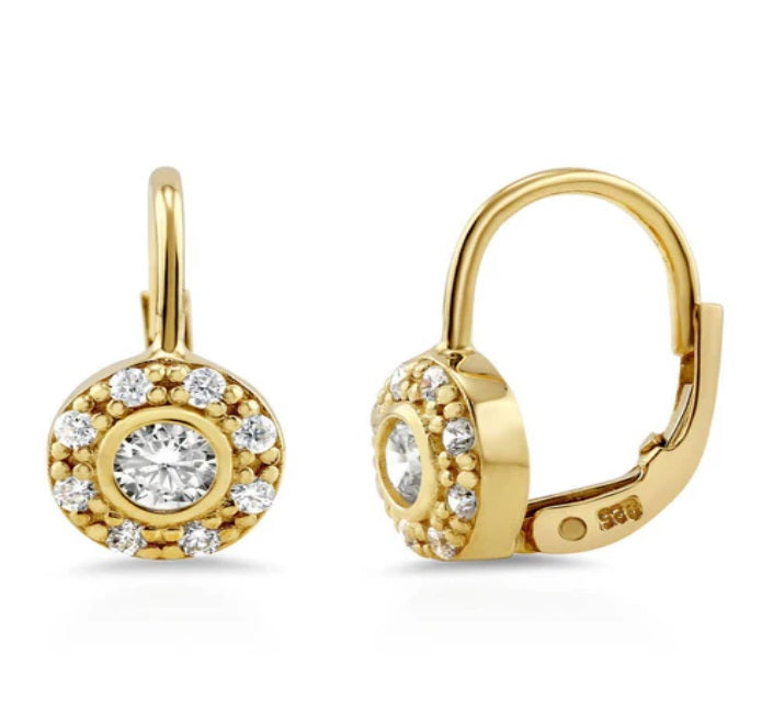 Halo Round CZ Leverback Dangle Earrings in Sterling Silver