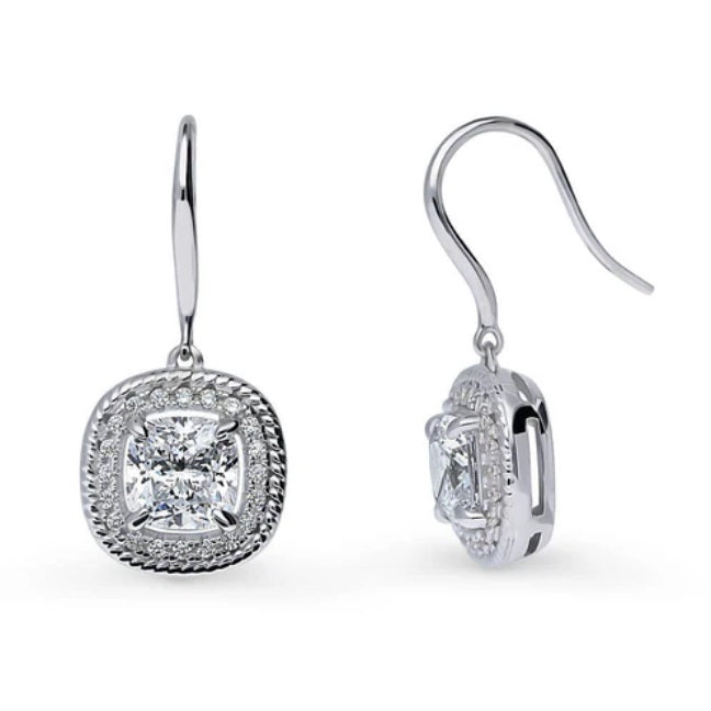 Elevate your ensemble with these stunning Art Deco Woven Halo Dangle Earrings, featuring premium 4-carat cushion-cut cubic zirconia stones accented with round CZ for a total of 0.4 carats. Crafted from rhodium-plated sterling silver, these earrings boast timeless elegance with their 19th-century-inspired design. Complete with fish hook backs and a FREE gift box, they're the epitome of style and sophistication.