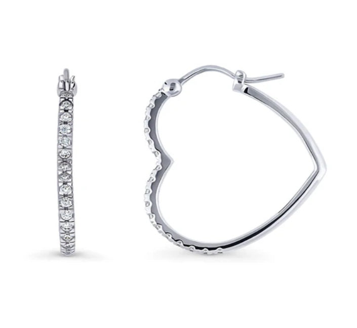 Heart CZ Medium Hoop Earrings in Sterling Silver 1"