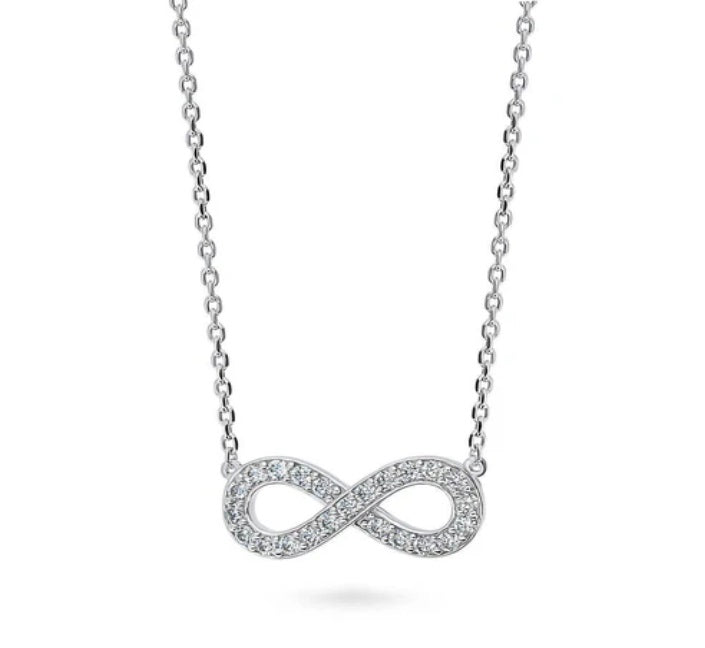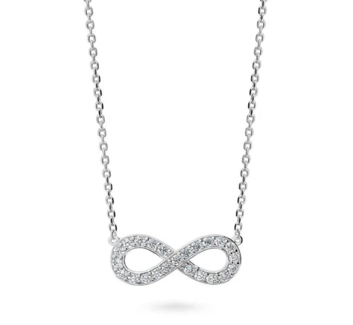 Embodying elegance and versatility, this infinity pendant necklace features a pave setting of 23 premium quality round cubic zirconia stones, totaling 0.23 carats. Crafted from rhodium-plated sterling silver, it boasts a polished finish and an adjustable rolo chain, ensuring a perfect fit for any occasion.