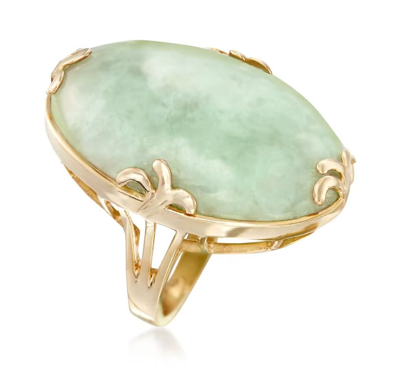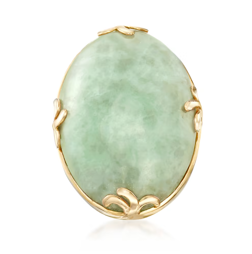 At the core of this exquisite creation lies a large oval cabochon-cut jade, measuring an impressive 30x20 mm. The jade exhibits a rich green hue, symbolizing harmony, balance, and tranquility. The cabochon cut emphasizes the smooth, polished surface of the jade, showcasing its natural beauty and serene color to its fullest.