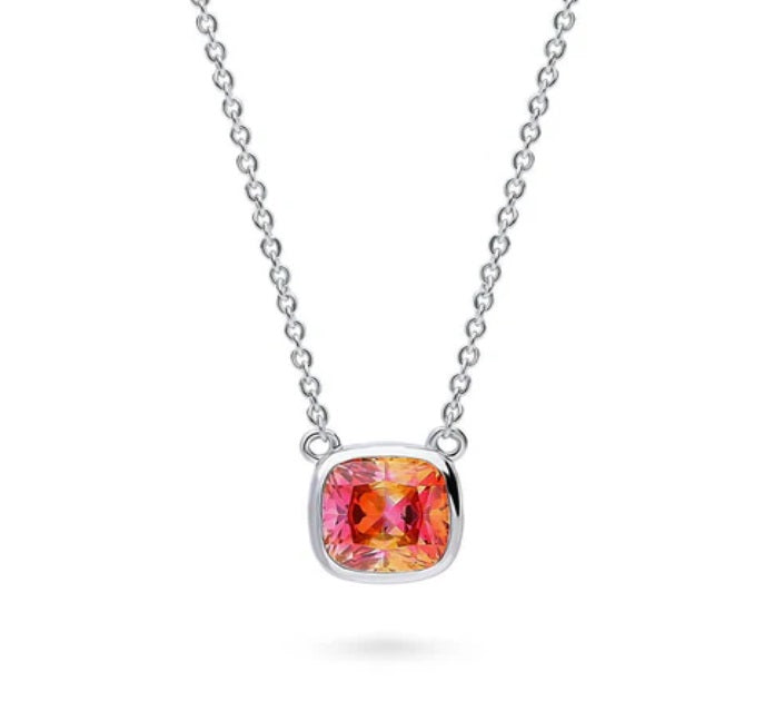 Indulge in the mesmerizing allure of our kaleidoscope solitaire pendant necklace, crafted from sterling silver with rhodium plating and stamped 925 for authenticity. Adorned with a premium quality 1.25-carat cushion red orange cubic zirconia in a bezel setting, this necklace boasts a delicate yet captivating design. With an adjustable chain, lobster claw clasp, and included gift box, it's the perfect accessory for any occasion.