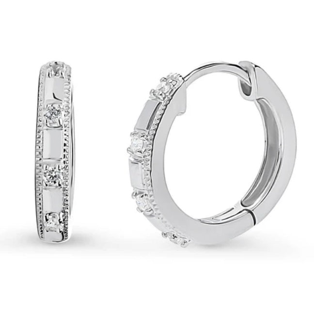 Introducing our Sterling Silver Milgrain Hoop Earrings, crafted with rhodium-plated sterling silver and set with premium round cubic zirconia stones totaling 0.12 carats. These elegant hoops measure 0.1 inch in width and 0.6 inches in diameter, secured with hinged snap backs for effortless wear. Designed for understated sparkle, these earrings are a timeless addition to any jewelry collection and come packaged in a complimentary gift box.