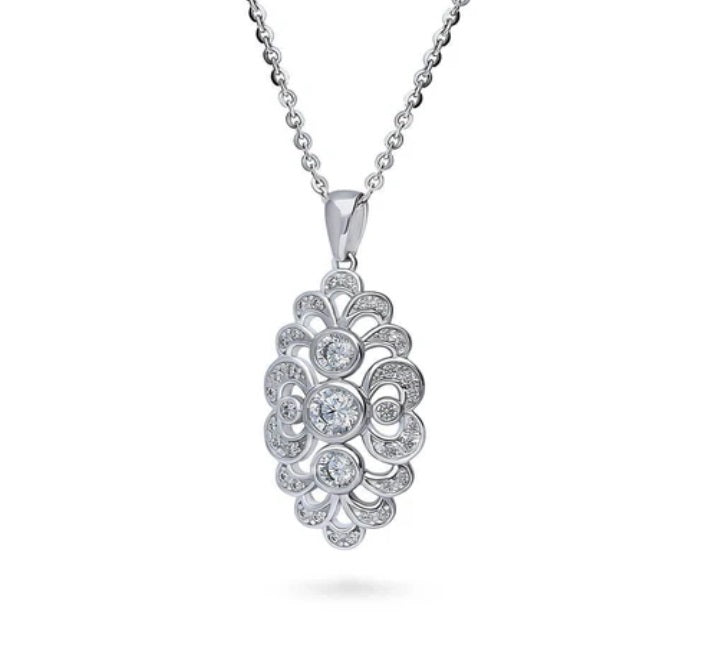 Elevate your style with this Art Deco-Style navette pendant necklace, crafted from sterling silver with a rhodium plated finish. Adorned with premium quality round cubic zirconia stones totaling 0.93 carats, this necklace boasts mesmerizing patterns and vintage-style details. The pendant, measuring 1.3" in length and 0.55" in width, hangs elegantly from an 18" rolo chain with a lobster claw clasp, ensuring timeless glamour for any occasion.