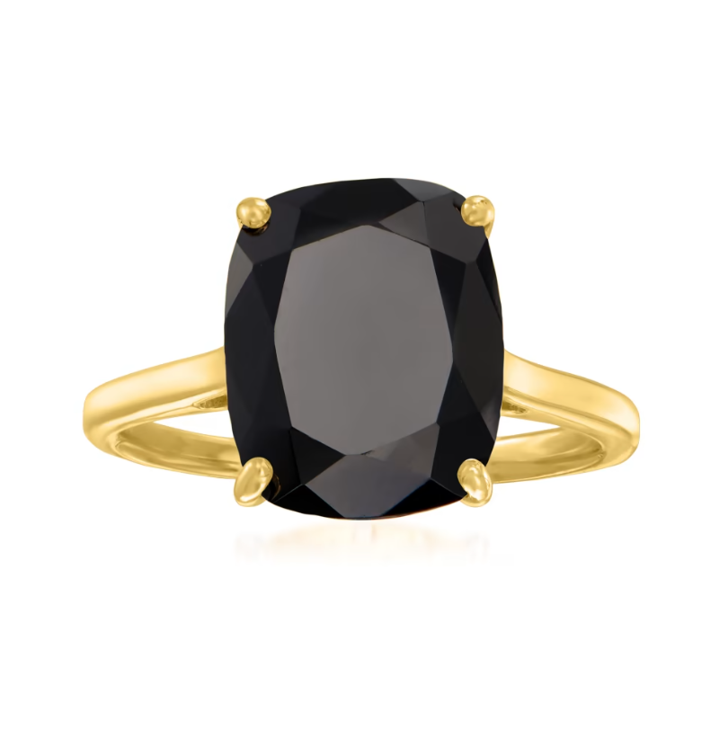 Measuring 1/2 inch in width, the piece features a single rectangle cushion-cut onyx, measuring 12x10 mm. The onyx's bold black color offers a striking contrast against the warm glow of the yellow gold finish, making it a captivating focal point. Known for its protective properties and association with strength and resilience, onyx adds not only beauty but also meaning to this elegant piece.