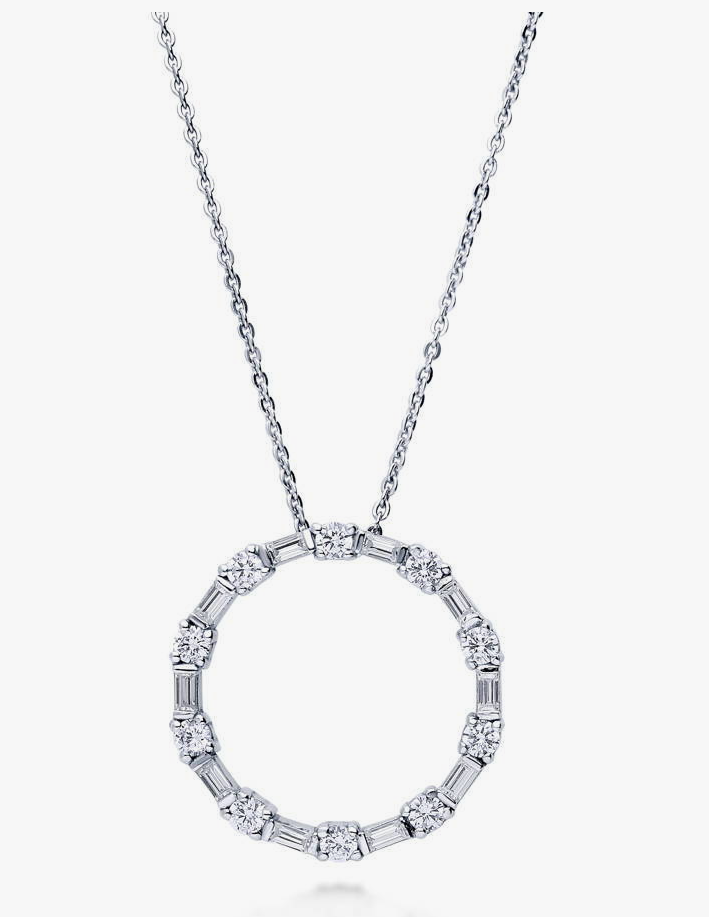 The N1181-01 necklace is a paragon of understated elegance, crafted from high-quality 925 Sterling Silver with a Rhodium plating for enduring shine and a polished finish. The design features a delicate 0.1 inch wide, 0.8 inch diameter circular pendant on an 18-inch Rolo chain with a 1mm width, ensuring a perfect fit with its spring ring clasp. Adorned with 10 round cut and 10 baguette cut cubic zirconia stones, all clear in color and expertly set in 4-prong and bar settings, this necklace achieves a total carat weight of 0.85 ct.tw. Weighing 3.2 grams, it offers both lightweight comfort and splendid radiance, suitable for any occasion and style preference.