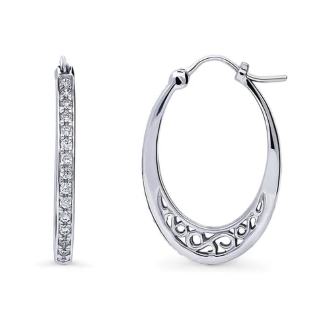 Introducing our Oval Bar Filigree Hoop Earrings, meticulously crafted from rhodium-plated sterling silver and adorned with premium round cubic zirconia stones totaling 0.45 carats. These elegant earrings feature a unique oval bar filigree design, measuring 1 inch in length and 0.74 inches in width, with secure latch backs for comfortable wear. Elevate your style with these stunning earrings, which come packaged in a complimentary gift box.