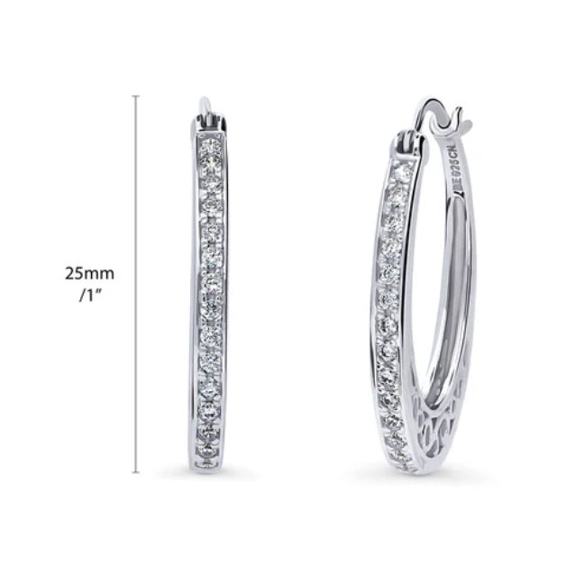 Oval Bar CZ Medium Hoop Earrings in Sterling Silver 1"