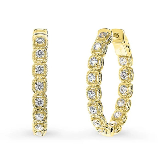 Elevate your style with our Oval Milgrain Art Deco Inside-Out Hoop Earrings, crafted from yellow gold flashed sterling silver and adorned with 1.68 carats of dazzling round cubic zirconia stones. These vintage-inspired hoops measure 1.2" in length and 1" in width, featuring a polished finish and secure hinged snap backs. Perfect for adding a touch of glamorous brilliance to any ensemble, these earrings come packaged in a FREE gift box, making them an ideal present for yourself or someone special.