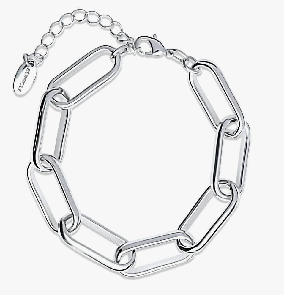 This sleek bracelet, marked with style number B346-02, boasts a polished silver-tone plating over a sturdy base metal alloy. It features a link chain measuring 7.5 inches with an additional 2-inch extension, allowing for a customized fit, and is 11mm wide. The piece is secured with a lobster claw clasp and weighs 22 grams, making it a substantial yet comfortable choice for everyday wear or special occasions.