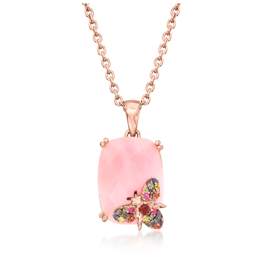 Pink Opal Bumblebee Pendant Necklace with .10 ctw Multicolored Sapphire and Garnet Accent in 18kt Rose Gold Over Sterling. 18"