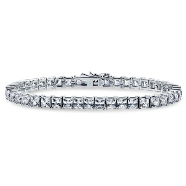 Elevate your style with our exquisite Sterling Silver Princess Cut Tennis Bracelet, adorned with premium cubic zirconia stones totaling 15.2 to 17.6 carats. Crafted with stamped 925 sterling silver and rhodium plating, this bracelet exudes timeless sophistication. Featuring a sleek 4mm width and a secure box with tongue and safety clasp, it's the perfect accessory for any occasion.