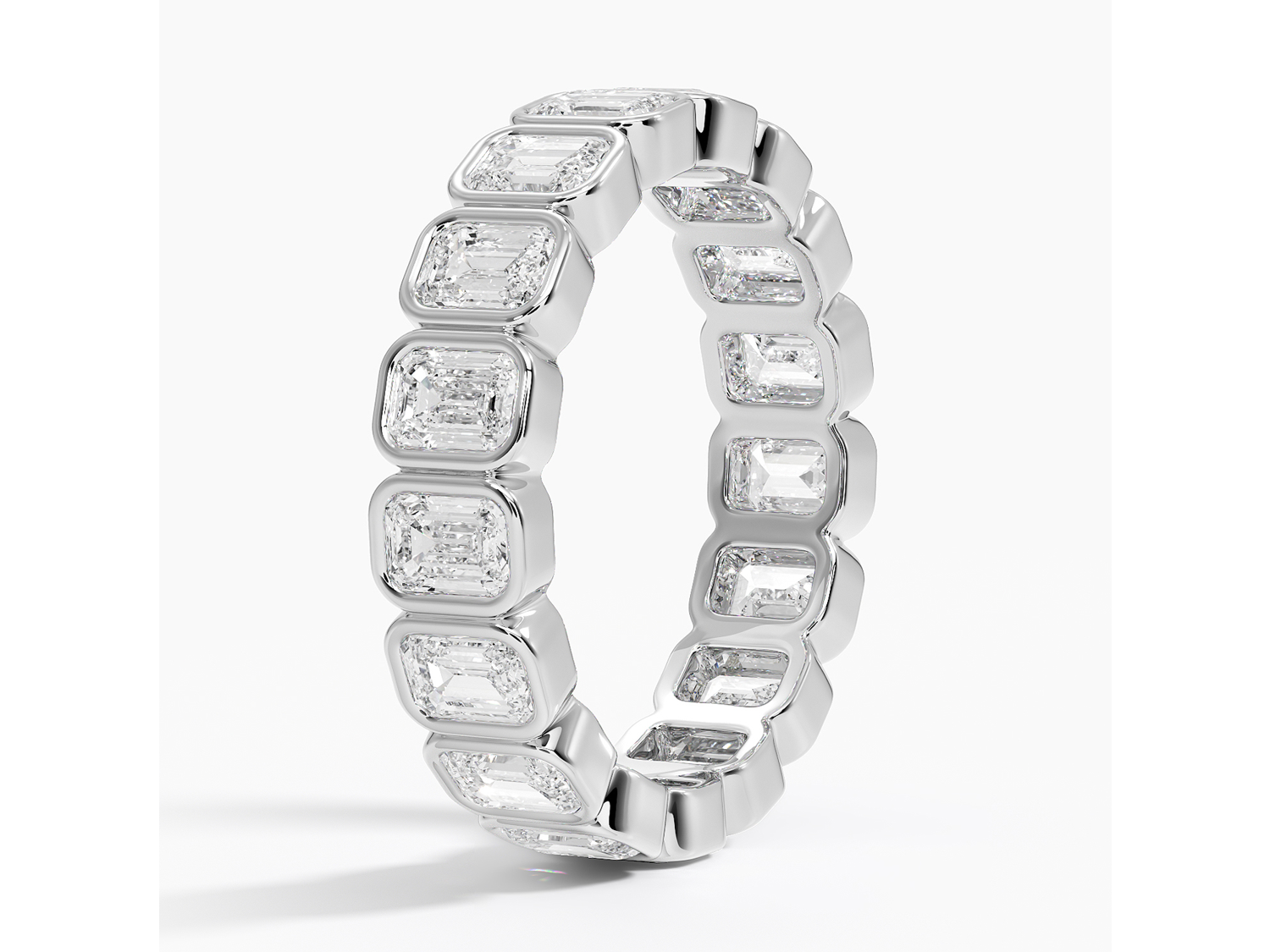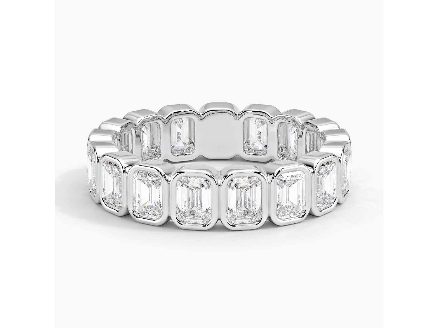 Experience the epitome of elegance with our Lab Diamond Ring. Featuring bezel-set emerald cut lab-grown diamonds encircling the finger, this dazzling piece captivates with its timeless allure. Meticulously crafted in 18K white gold, our eternity bands ensure both comfort and glamour, offering a customized fit tailored to each unique finger size, making it the perfect symbol of everlasting beauty.