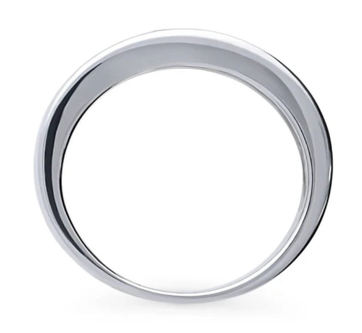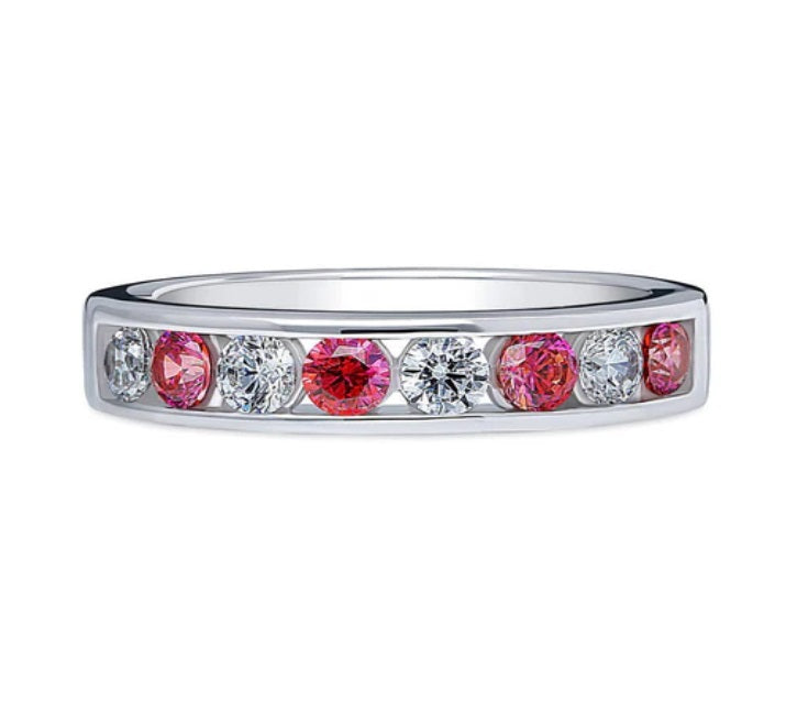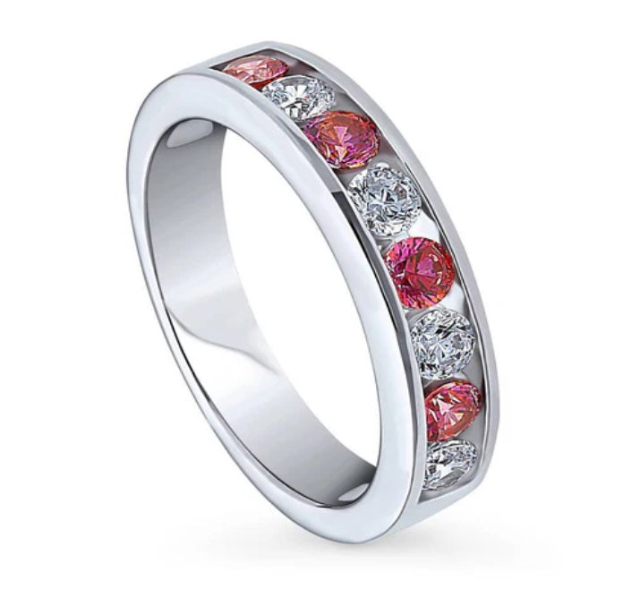Adorned with premium quality 0.88 carat total round red cubic zirconia stones, this sterling silver half eternity ring exudes elegance. Its channel setting highlights the vibrant red accents against a clear cubic zirconia background, set in a simple and posh design. With a polished finish and nickel-free composition, it's both stylish and comfortable.