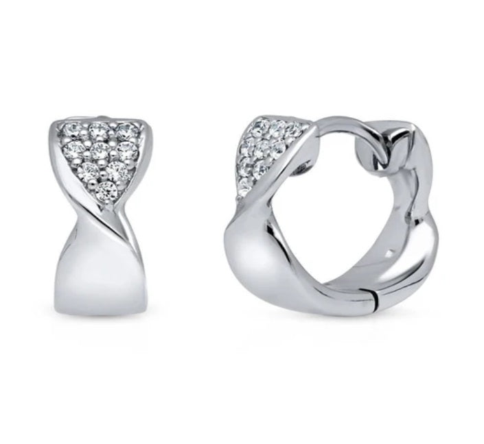 Ribbon CZ Small Huggie Earrings in Sterling Silver 0.5"