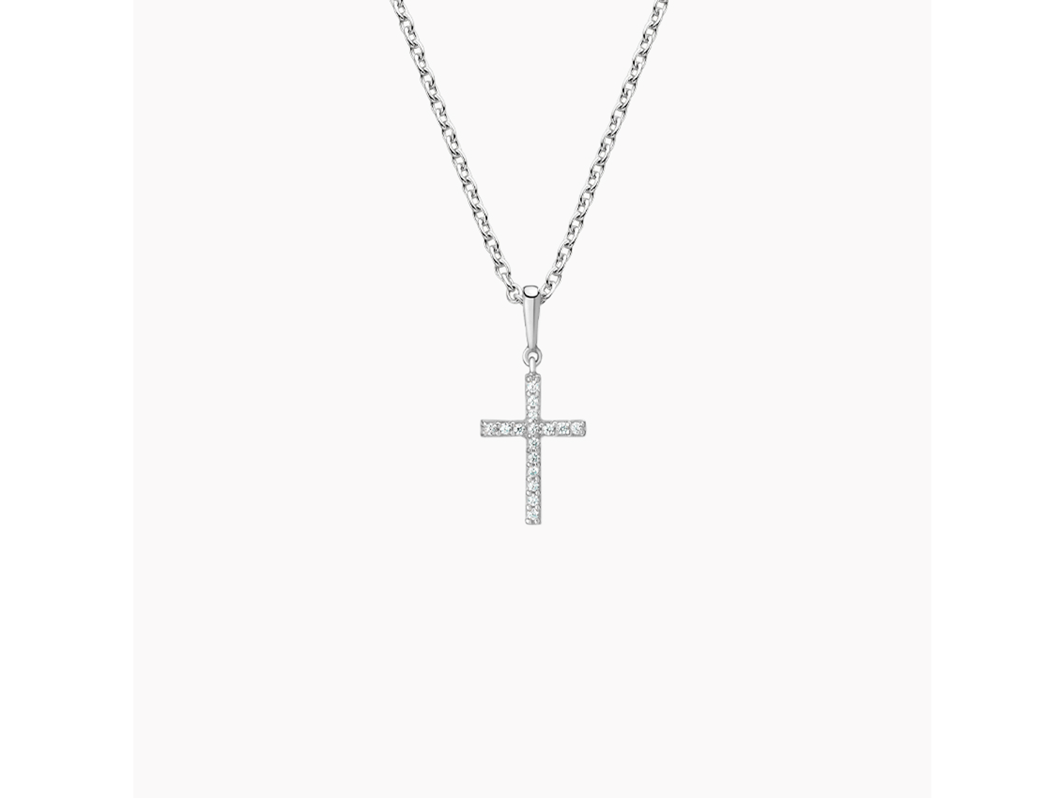 Radiate spirituality and elegance with this silver cross pendant adorned with 16 round diamonds in a shared prong setting, totaling 1/15 carat weight. Perfect on its own or stacked with other chic pieces, it adds a touch of divine beauty to any ensemble.