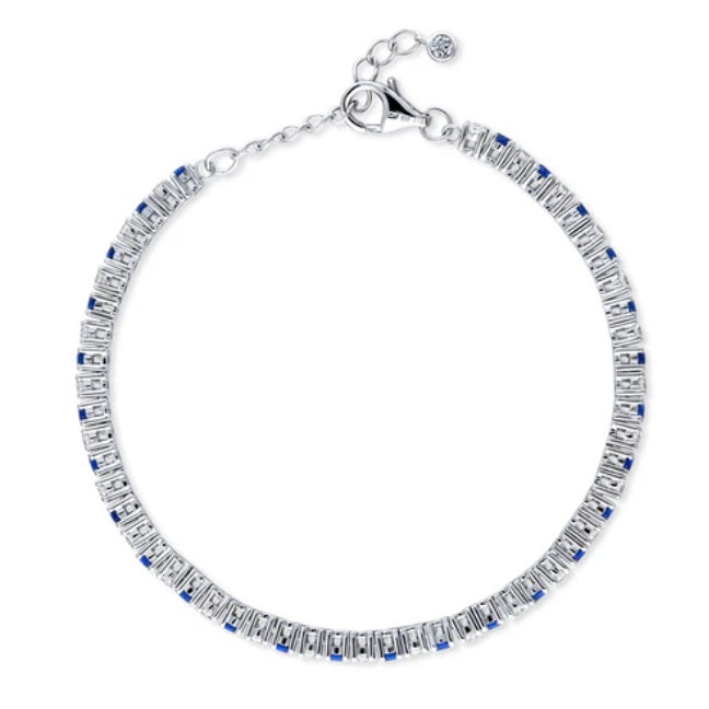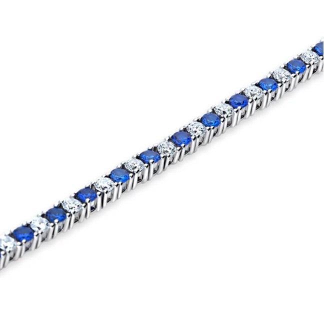 Indulge in timeless elegance with our sterling silver tennis bracelet, boasting a total of 3.24 carats of brilliant simulated blue sapphire cubic zirconia stones, each meticulously set in a secure prong setting. Crafted with care, this 6.5-inch bracelet features a 1-inch extension for the perfect fit, adorned with captivating alternating colors that create an enchanting allure. Complete with a lobster claw clasp and presented in a FREE gift box, this classic piece is destined to become a cherished favorite.