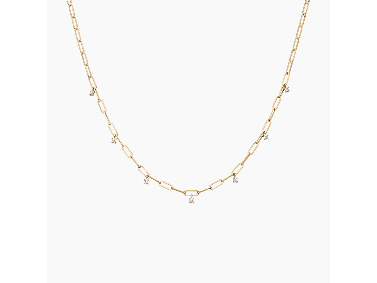 Elevate your style with the timeless sparkle and modern edge of this 14K Yellow Gold Lab Diamond Necklace. Seven shimmering lab diamonds gracefully dangle from a sleek paperclip chain, creating a captivating and sophisticated look. Perfect for any occasion, this necklace combines classic elegance with contemporary flair, making it a beloved choice by Brilliant Earth designers and customers alike, representing the epitome of fashion and design excellence.