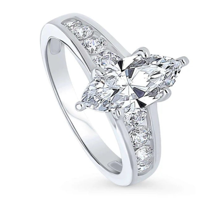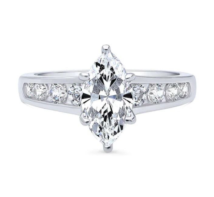 Elevate your style with our exquisite Sterling Silver Marquise Solitaire Ring. Featuring a dazzling 1.6 carat marquise cubic zirconia in a secure 6-prong setting, complemented by 0.64 ct. tw. of round CZ stones in a delicate channel setting. Crafted from stamped 925 sterling silver, rhodium plated for lasting brilliance, and accompanied by a free gift box. Embrace timeless elegance with this stunning piece, perfect for those seeking a sophisticated statement.