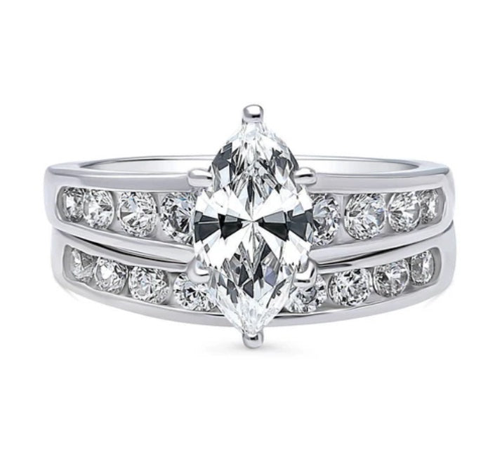 Elevate your style with our exquisite 2-piece solitaire with side stones and half eternity ring set, crafted from sterling silver with rhodium plating for lasting beauty. The main attraction is a dazzling 1.6 carat marquise cubic zirconia, complemented by 1.18 carats of round CZ stones in a channel setting, creating a regal and vibrant sparkle. The rings measure 5mm in total width and come with a FREE gift box for added convenience. The marquise cut, with its timeless elegance and vintage-inspired allure, adds a touch of sophistication to any ensemble. If you're seeking an edgy yet chic ring, look no further than our stunning marquise cut styles.
