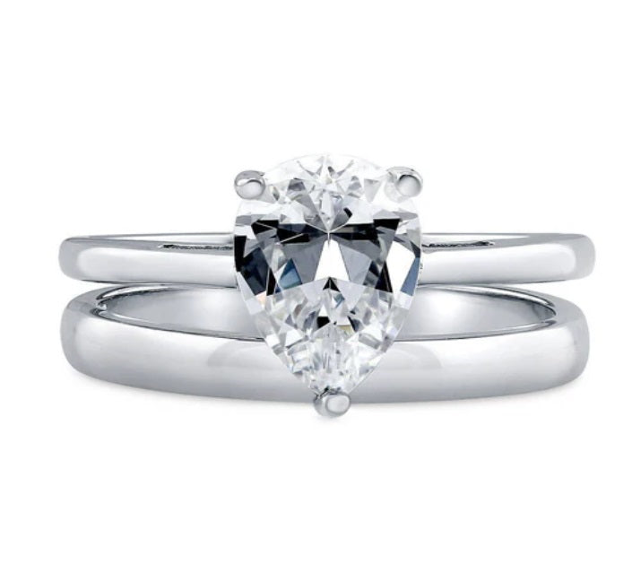 Embrace modern luxury with this 2-piece solitaire ring set, crafted from sterling silver and rhodium plated for lasting brilliance. The centerpiece of this set is a dazzling 1.8 carat pear-cut cubic zirconia, measuring 10mm x 7mm, delicately held in a secure 3-prong setting. Minimalist in design, the bands measure 4.75mm in total width, adding a touch of simplicity to the scintillating centerpiece. Packaged in a FREE gift box, this set is a perfect blend of elegance and sophistication.