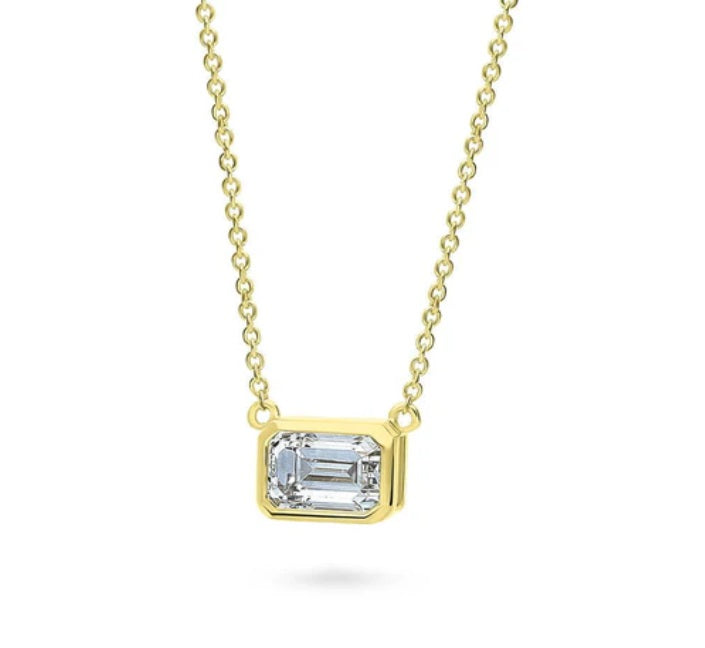 Elevate your style with this exquisite east-west solitaire pendant necklace, crafted from sterling silver with a luxurious yellow gold flashed finish and stamped 925 for authenticity. Featuring a premium quality 1 carat (7mm x 5mm) emerald-cut cubic zirconia stone in a sleek bezel setting, this necklace exudes sophistication and glamour. Whether for everyday wear or special occasions, the adjustable 16"-18" rolo chain, lobster claw clasp, and complimentary gift box make it a versatile and elegant accessory that's sure to become a favorite.