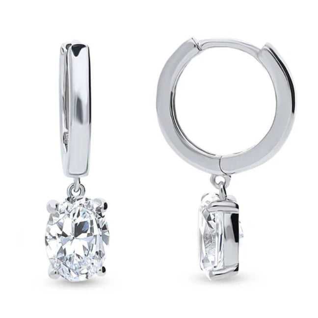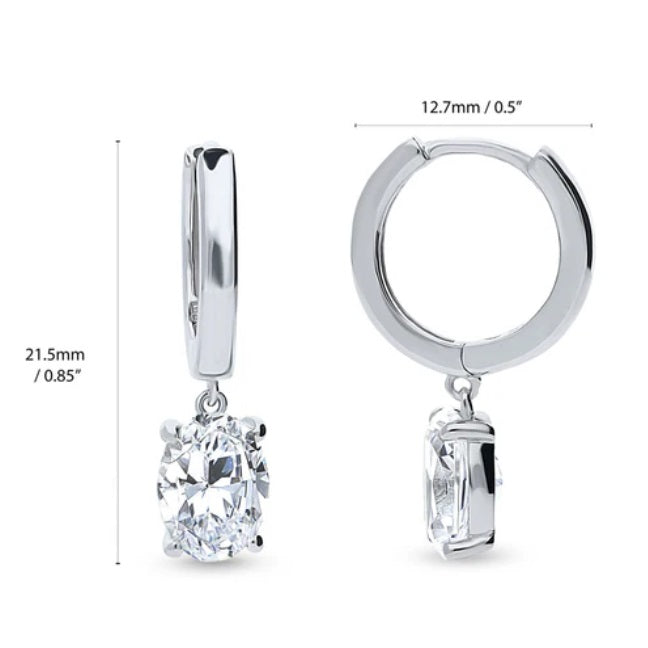 Add a touch of luxe simplicity to your ensemble with our Solitaire Huggie Hoop Dangle Earrings, meticulously crafted from stamped 925 sterling silver with a radiant rhodium plated finish for both durability and sophistication. Featuring premium quality oval cubic zirconia stones, each measuring 8mm x 6mm and totaling 2.4 carats, delicately set in secure 4-prong settings, these earrings exude elegance. The sparkling stones dangle delicately from slim hoops, measuring 0.85" in length and 0.23" in width, with a hoop diameter of 0.5", secured with hinged snap backs for comfortable wear.