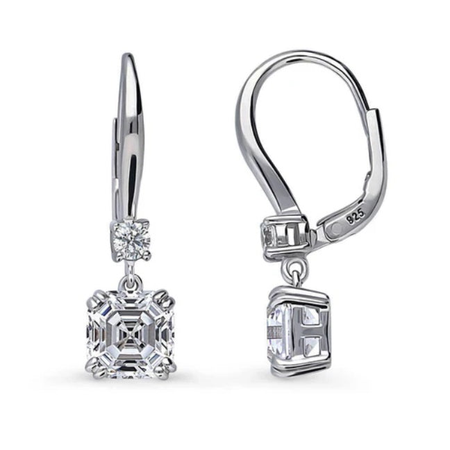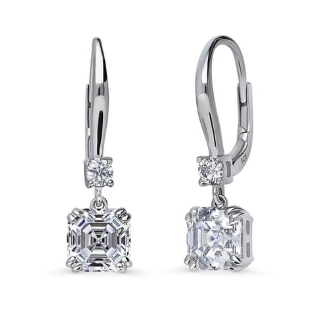 Solitaire 4ct Asscher CZ Leverback Dangle Earrings in Sterling Silver