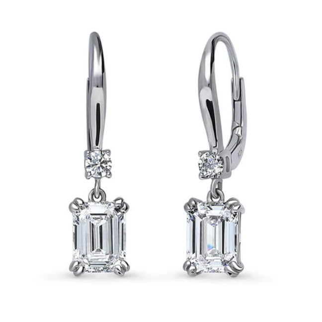 Elevate your elegance with our Solitaire with Side Stone Dangle Earrings Set, featuring two pairs (four pieces) of exquisite earrings crafted from stamped 925 sterling silver, with a radiant rhodium plated and yellow gold flashed finish for timeless allure. Each earring showcases premium quality cubic zirconia stones, with main stones totaling 6.8 carats in stunning emerald cuts measuring 8mm x 6mm, delicately set in secure 4-prong settings. Accented with an additional 0.44 carats of round CZ stones in prong settings, these earrings offer sophistication and glamour.