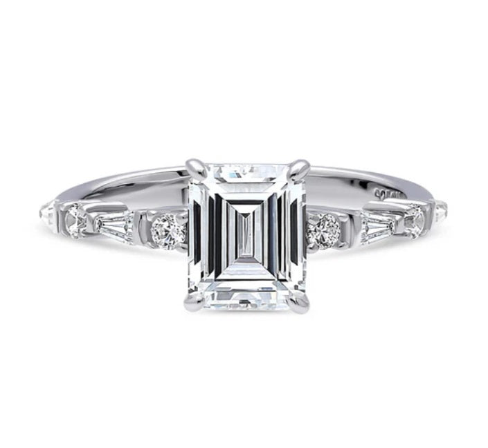 Elevate your style with this sterling silver ring showcasing a stunning 1.7-carat step emerald-cut cubic zirconia complemented by shimmering round and tapered baguette CZ accents. With a polished finish and free gift box, it's a luxurious addition to any jewelry collection.