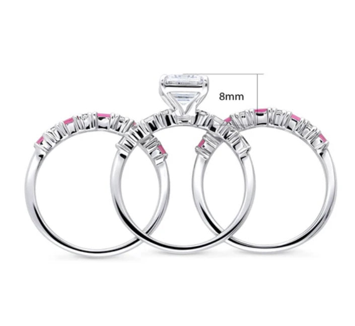 Indulge in timeless sophistication with this exquisite 3-piece art deco solitaire ring set, featuring a premium quality emerald-cut cubic zirconia as the main stone. The emerald cut, renowned for its simplicity and elegance, is complemented by simulated ruby red side stones, adding a touch of vintage-inspired glamour to your ensemble. Crafted from sterling silver with rhodium plating, this set radiates luxury and refinement, making it a perfect choice for those who appreciate classic sophistication.