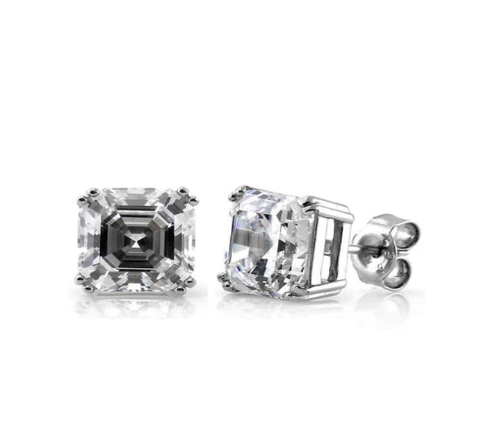 Indulge in everyday elegance with these solitaire stud earrings, featuring premium asscher-cut cubic zirconia stones in a timeless 4-prong setting. Crafted from rhodium-plated sterling silver and adorned with stones ranging from 4mm to 9mm, these earrings offer a versatile and sophisticated addition to your jewelry collection. Perfect for both casual and formal occasions, they effortlessly elevate any ensemble with their brilliant sparkle and understated charm.