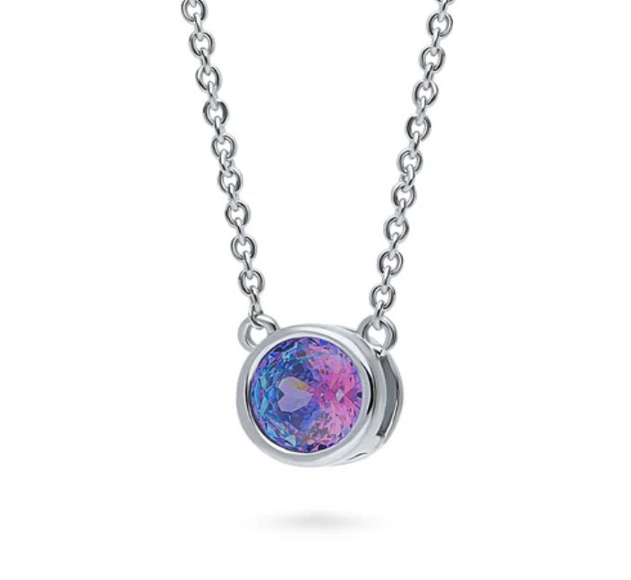Elevate your style with the kaleidoscope solitaire pendant necklace, featuring a premium quality round cubic zirconia stone set in a bezel setting. Crafted from sterling silver with a rhodium plated finish, this necklace exudes dainty allure and timeless glamour. The adjustable chain measures 16 to 18 inches in length, ensuring a perfect fit, and the pendant itself measures 0.29 inches in diameter. Secured with a lobster claw clasp, this necklace comes in a free gift box, making it an ideal choice for any occasion.