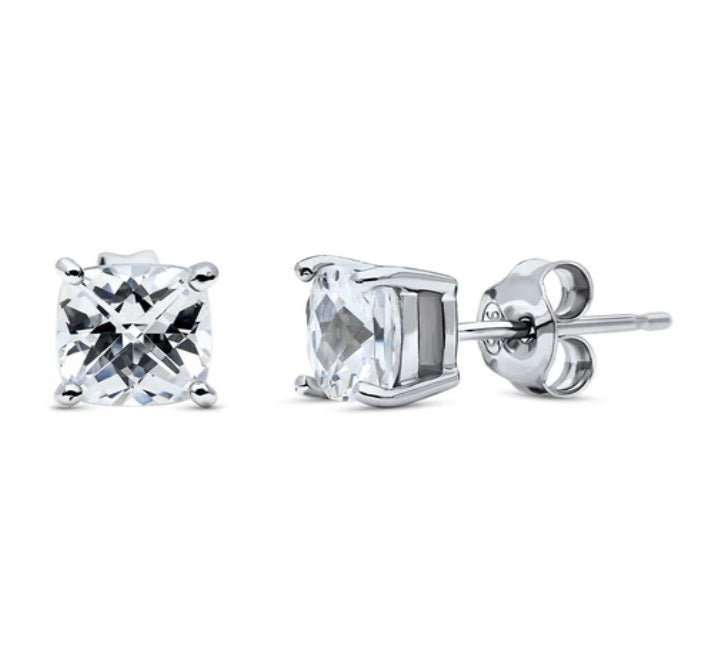 Illuminate your ensemble with the radiant allure of these checkerboard cushion cubic zirconia solitaire stud earrings. Crafted from sterling silver and rhodium plated for enduring brilliance, these earrings feature premium quality stones totaling 2.5 carats, with each stone weighing 1.25 carats and measuring 6mm. The vibrant facets of the cushion cut stones create kaleidoscopic shimmers of pure perfection, while the 4-prong setting ensures security and elegance. Measuring 0.23 inches in both length and width, these earrings are secured with center posts and butterfly backs for comfortable wear. Presented in a complimentary gift box, they make a timeless addition to any jewelry collection.