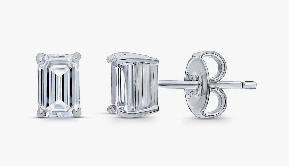 The E673 earrings embody sophistication and brilliance, meticulously crafted from 925 Sterling Silver and finished with a Rhodium plating for enduring shine and polish. These earrings are designed with elegance in mind, featuring prong-set emerald cut cubic zirconia stones in a clear color, available in various sizes to cater to different preferences and occasions. The sizes range from 6mm x 4mm (1.32 ct.tw) to 11mm x 9mm (10.42 ct.tw), offering a diverse selection for a custom look. The classic posts with butterfly backs ensure secure and comfortable wear. With their timeless design and sparkling appearance, these earrings are perfect for adding a touch of glamour to any outfit, suitable for both everyday elegance and special events.