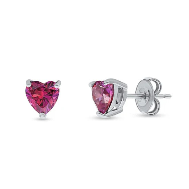 Add a touch of romance to your look with our Heart Shaped Red Cubic Zirconia Stud Earrings. Crafted from rhodium-plated sterling silver, these dainty studs feature premium 6mm heart-shaped stones totaling 1.4 carats, set in secure 3-prong settings. Measuring 0.24" in length and width, they're adorned with butterfly backs for comfortable wear. Packaged in a FREE gift box, they're perfect for expressing love or adding a pop of fiery color to any outfit.