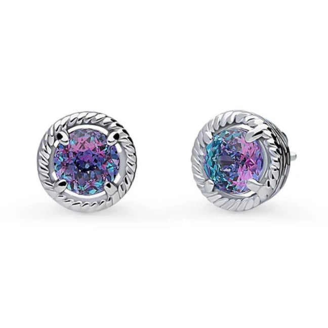 Introducing our Cable Halo Solitaire Kaleidoscope Stud Earrings, crafted from sterling silver with a sleek rhodium plating. These earrings feature premium-quality round purple aqua cubic zirconia stones, totaling 2.5 carats (1.25 carats per stone), each set in a secure 4-prong setting. Measuring 0.4 inches in diameter, they are adorned with a cable halo design that seamlessly blends purple and aqua hues for an understated yet glamorous look. With center posts and butterfly backs, these earrings offer both style and comfort.