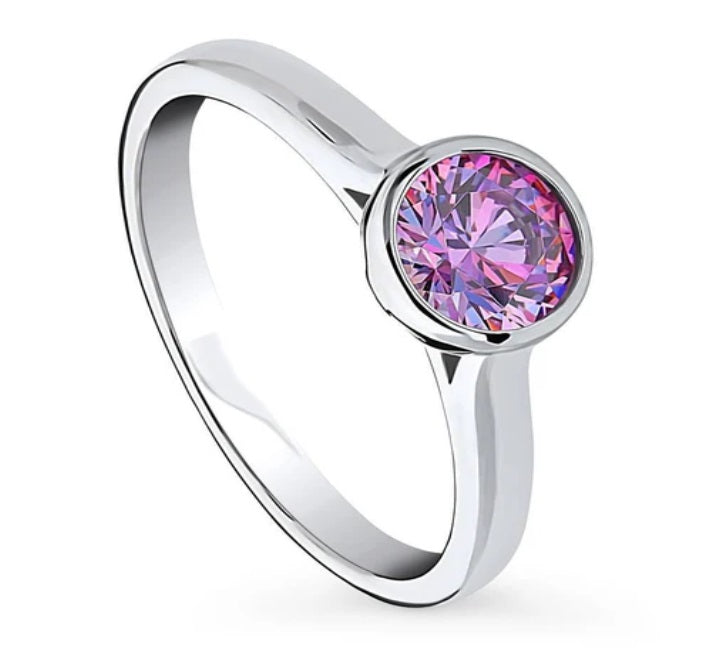 Solitaire Purple Bezel Set Round CZ Ring in Sterling Silver 0.8ct