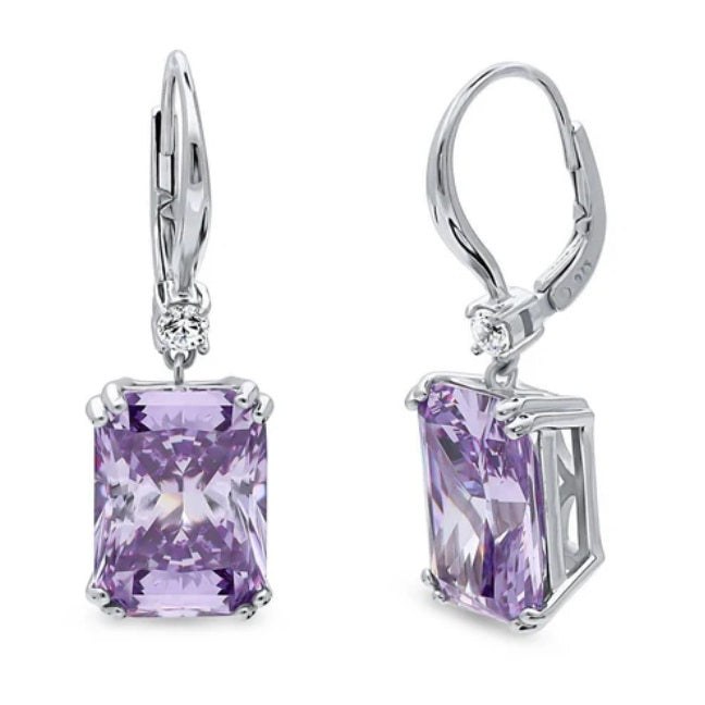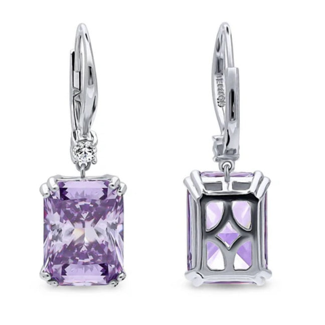 Solitaire Purple Radiant CZ Leverback Earrings in Sterling Silver 17ct