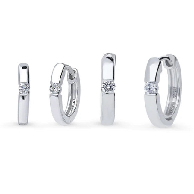 Add a touch of posh sophistication to your ensemble with our Sterling Silver Solitaire Round Stone Hoop Earring Set. Crafted from stamped 925 sterling silver with rhodium plating, these nickel-free earrings feature premium round cubic zirconia stones in a sleek bar setting. With a total weight of 0.22 carats for the main stones and 0.12 carats for the accents, this set of 2 pairs (4 pieces) comes with a FREE gift box, perfect for stacking or wearing alone for a beautiful ear story.
