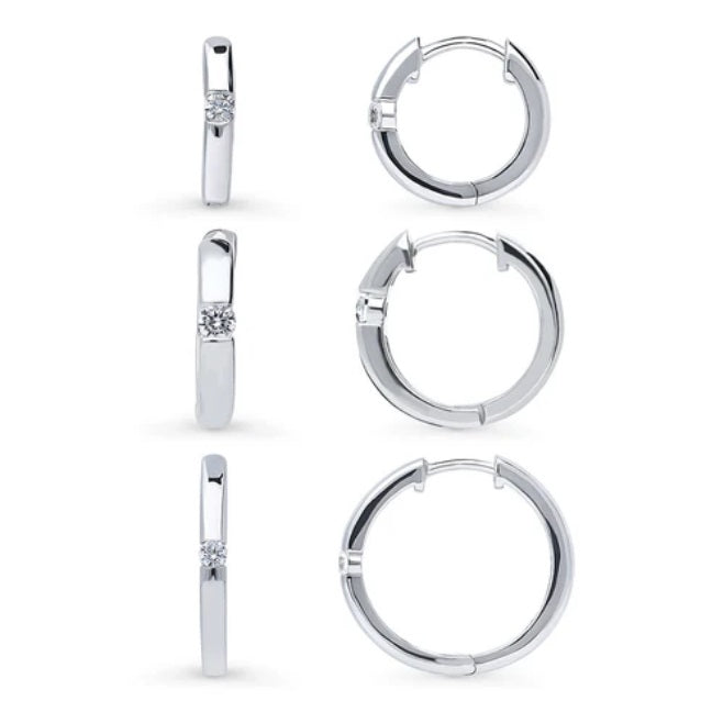 Elevate your style with our Sterling Silver Solitaire Hoop Earring Set, featuring premium round cubic zirconia stones in a sleek bar setting. Each set includes three pairs (six pieces) of earrings, totaling 0.22 carats per main stone and 0.24 carats in accent stones. Crafted with stamped 925 sterling silver, rhodium plating, and nickel-free materials, these earrings offer posh sophistication and versatility for any occasion, complete with a FREE gift box.