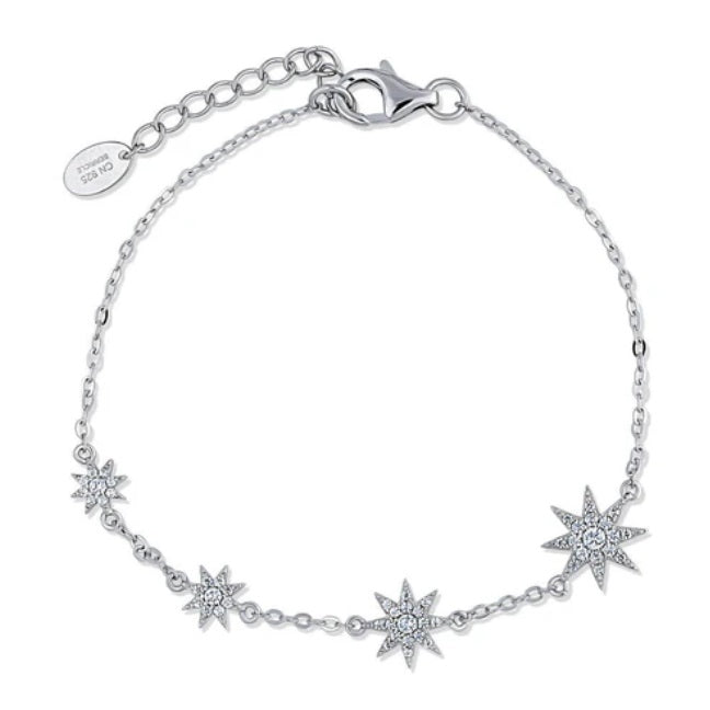 Celebrate the shining stars in your life with our sterling silver starburst chain bracelet, adorned with a total of 0.39 carats of round cubic zirconia stones in a dazzling pave setting. Crafted with care, this 7-inch bracelet features a 1-inch extension for the perfect fit, making it a symbol of empowering strength and elegance. Complete with a lobster claw clasp and presented in a FREE gift box, it's a meaningful accessory to cherish.
