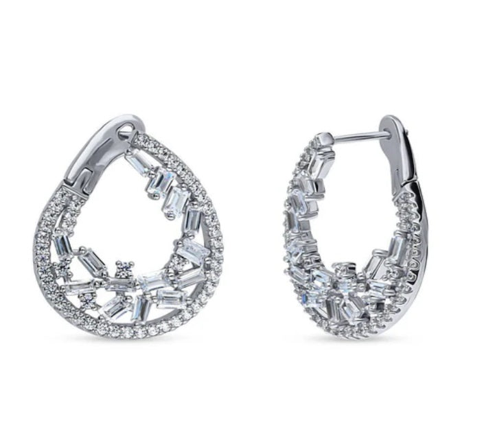 Elevate your ensemble with these rhodium-plated sterling silver teardrop cluster hoop earrings, adorned with a total of 3.14 carats of premium cubic zirconia stones in baguette and round cuts, arranged in a stunning combination of pave and prong settings. Measuring 0.9 inches in length and 0.75 inches in width, these earrings boast a contemporary silhouette that effortlessly accents any outfit with a burst of sparkle. Secured with hinged snap backs for ease of wear, they come complete with a complimentary gift box.
