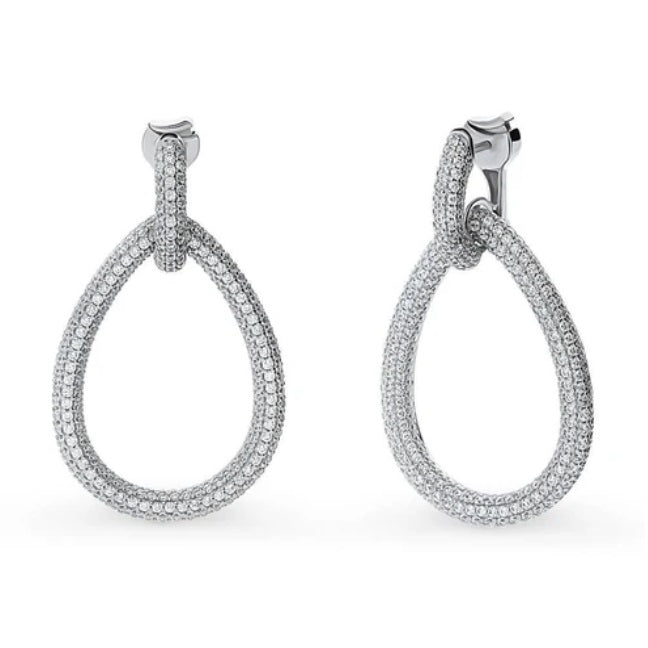 Introducing our Sterling Silver Teardrop Pave Earrings, adorned with premium round cubic zirconia stones totaling 7.73 carats for a glamorous and bold look. These earrings, crafted with rhodium-plated sterling silver, measure 1.95 inches in length and 1.13 inches in width, secured with comfortable hinged snap backs. Each earring shimmers with drops of delicate elegance, perfect for adding a touch of sophistication to any ensemble. Arrives packaged in a complimentary gift box.