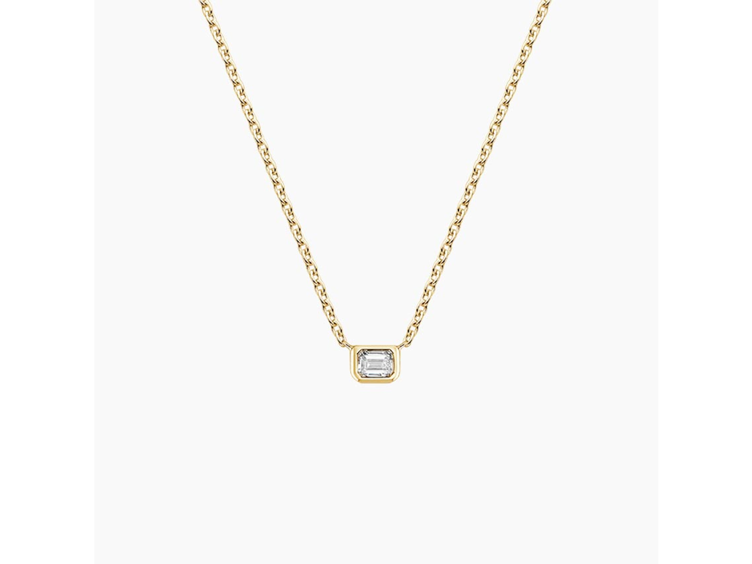 Crafted in radiant 14K yellow gold, our Emerald Lab Diamond Bezel Solitaire Pendant epitomizes sophistication with its emerald-cut lab diamond bezel-set in a modern yet timeless design. Adjust the necklace length effortlessly to 16 or 18 inches for personalized wear, showcasing the allure of this 1/10 carat sparkler.