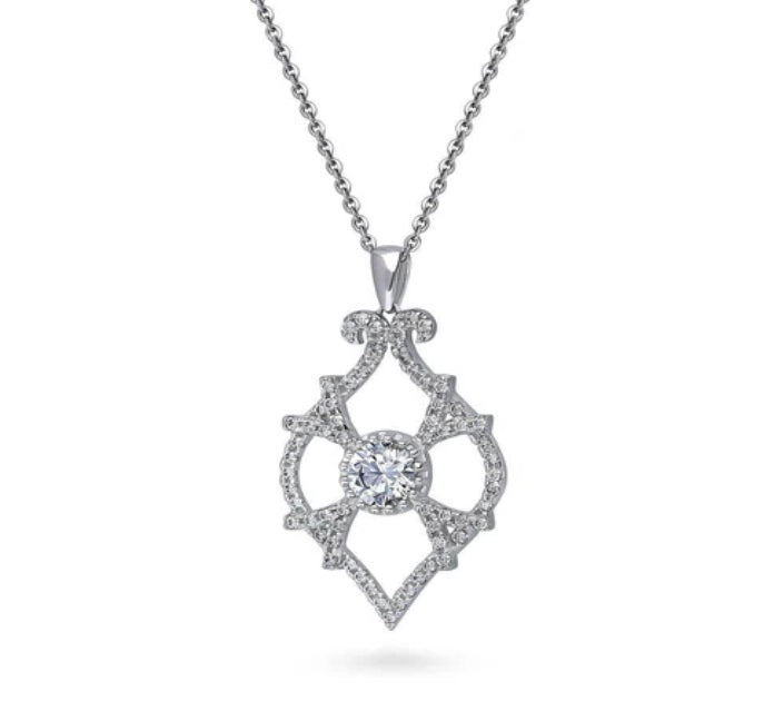 Crafted from sterling silver and plated with rhodium for a lasting shine, this art deco woven spade-shaped pendant necklace is adorned with premium quality round cubic zirconia stones totaling 1.65 carats. With a stunning round stone at its core and glistening side stones, this unique piece exudes sparkle and personality. The timeless elegance of the round cut stones, set in micro pave and milgrain bezel settings, makes this necklace a perfect choice for those who appreciate classic glamour.