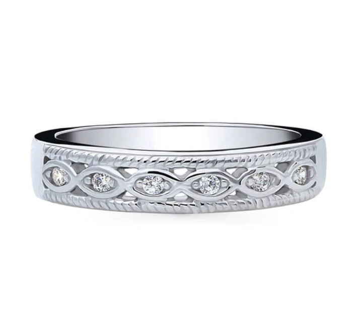 Fashioned from sterling silver and rhodium plated for enduring shine, this ring features a woven band design adorned with six premium quality round cubic zirconia stones, totaling 0.09 carats, set delicately in a 2-prong setting. With a height of 3mm and a band width of 2.7mm, this ring is a true testament to craftsmanship and elegance. Each ring comes with a complimentary gift box, making it a perfect choice for any occasion or as a thoughtful gift.