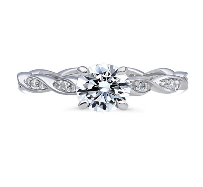 Introducing our elegant 925 Sterling Silver Woven Solitaire with Side Stones Ring, featuring a premium 1 carat round cubic zirconia as the main stone, delicately set in a 4-prong setting, and adorned with accents totaling 0.25 ct.tw in a classic prong setting. Crafted with rhodium-plated sterling silver and stamped 925 for authenticity, this exquisite piece boasts a ring height of 7mm and a band width of 2.4mm, offering a unique and posh twist to a timeless design. Each purchase includes a complimentary gift box, making it the perfect choice for those who appreciate timeless glamour with a touch of sophistication.