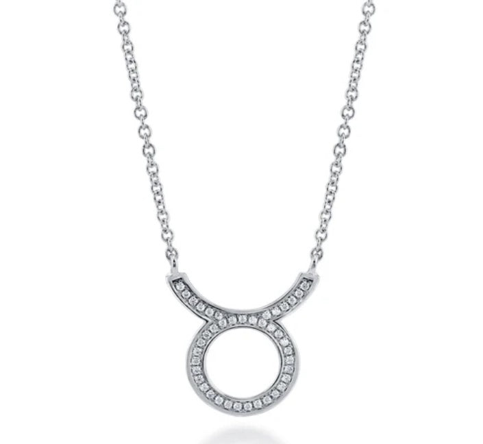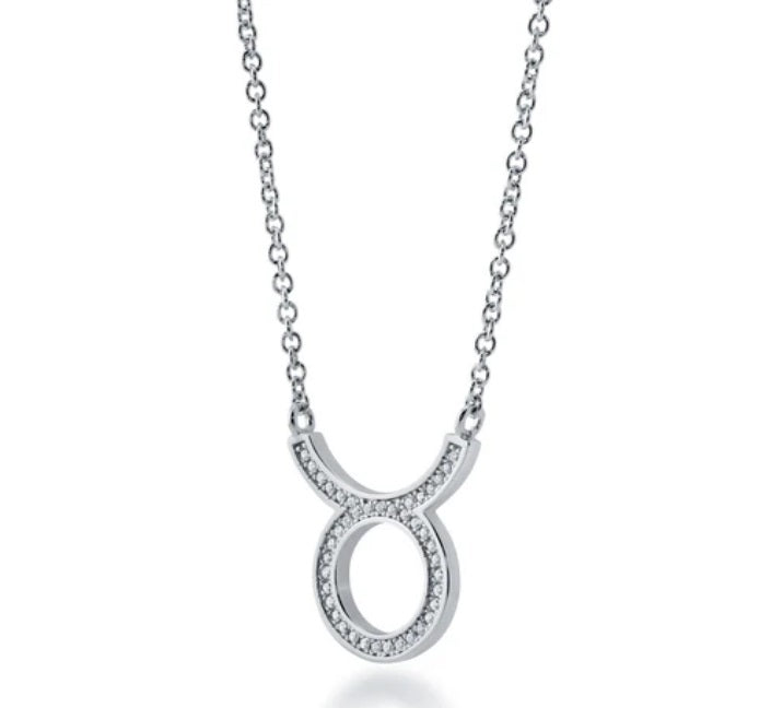 Embrace the essence of Taurus with this zodiac "Taurus" pendant necklace, designed for those born between April 20 to May 20. Crafted from sterling silver with rhodium plating and stamped 925, it features a stunning arrangement of premium quality 0.21 carat total (1mm) round cubic zirconia stones in a micro pave setting. Complete with an adjustable chain measuring 16 to 18 inches in length and a lobster claw clasp, this necklace includes a complimentary gift box, making it an ideal gift for the pleasure-seeking, dependable, and peaceful Taurus individual who appreciates beauty and comfort.